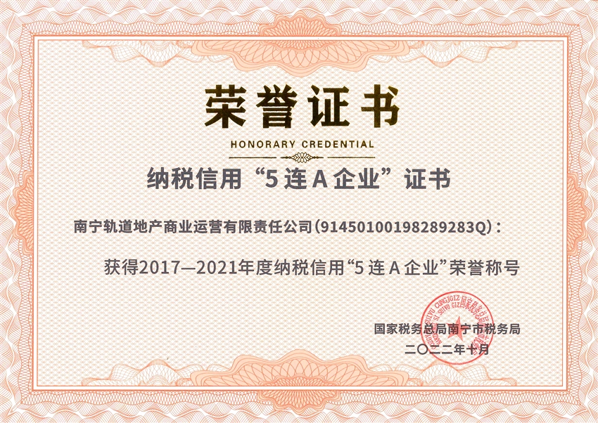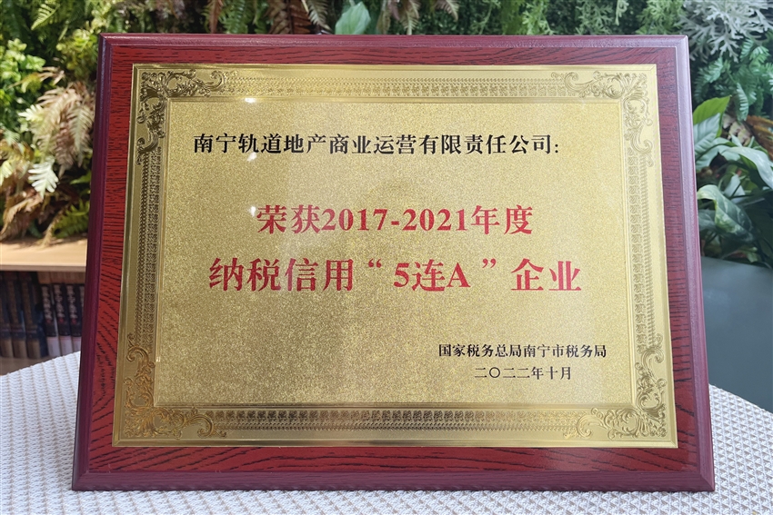 近日,軌道地產(chǎn)商業(yè)公司榮獲國家稅務(wù)總局南寧市稅務(wù)局授予的納稅信用“5連A”企業(yè)榮譽(yù)稱號(hào)。獲此殊榮,不僅是稅務(wù)機(jī)關(guān)對(duì)軌道地產(chǎn)商業(yè)公司稅務(wù)管理工作的充分肯定,更為軌道地產(chǎn)商業(yè)公司走上高質(zhì)量發(fā)展之路提供了強(qiáng)有力的支撐。